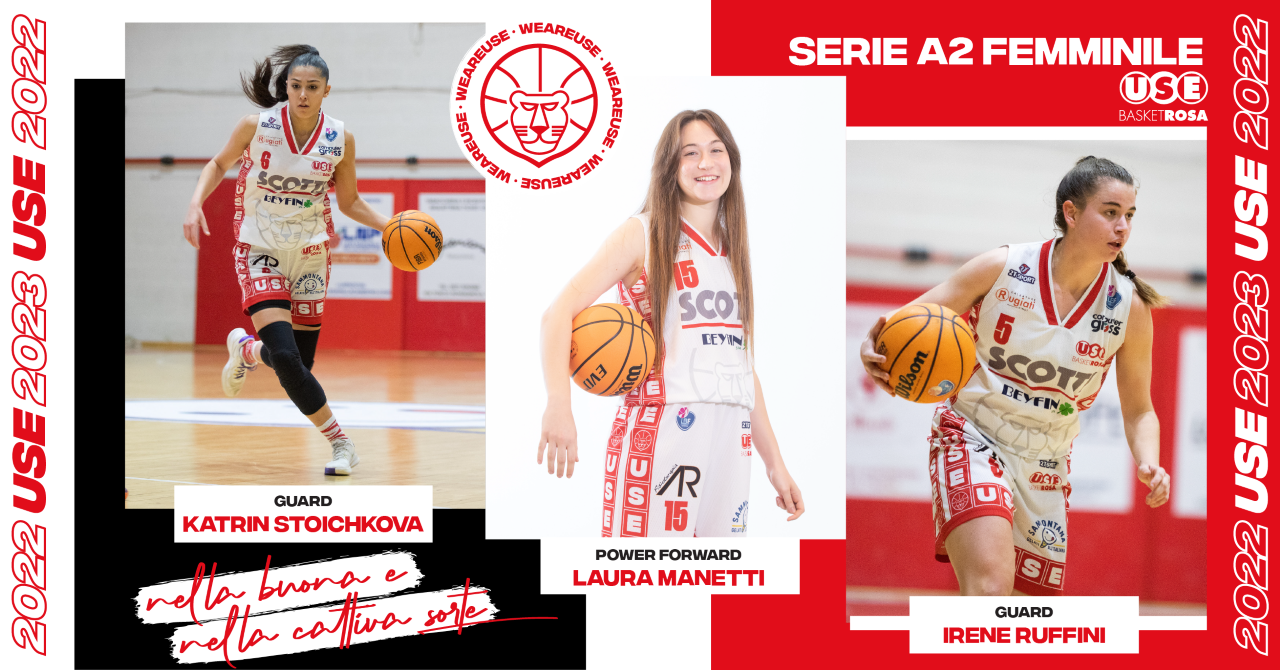 L'Use Rosa Scotti riparte da tre giovani: Laura Manetti, pivot classe '99, Irene Ruffini guardia classe 2003 e Katrin Stoichkova guardia classe '99, vestiranno anche il prossimo anno la maglia biancorossa. Le prime due sono nate e cresciute nel vivaio ed hanno vissuto gli ultimi, importanti anni guadagnandosi minuti e fiducia grazie alle loro buone prestazioni ed alla crescita costante sia dal punto di vista tecnico in campo che caratteriale all'interno del gruppo. Un percorso destinato a proseguire e, non a caso, coach Alessio Cioni le ha volute ancora nel roster.La classe '99 Katrin Stoichkova, bulgara di passaporto italiano, è invece al secondo anno a Empoli e si è guadagnata la conferma dopo la buona stagione che ha disputato. Anche nel suo caso il tecnico è convinto che ci siano ancora ampi margini di crescita e per questo ha puntato sulla sua conferma che è puntualmente arrivata. Per lei è un ritorno in A2 dopo il campionato giocato a Patti prima di arrivare all'Use Rosa.