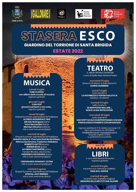 Questi i primi appuntamenti in cartellone di ‘Stasera Esco 2022’ promosso da Comune di Empoli, Giallo Mare Minimal Teatro, il Centro Studi Musicali Ferruccio Busoni, l’associazione Empoli Jazz, Libreria Rinascita, e il Centro Attività Musicale (CAM).