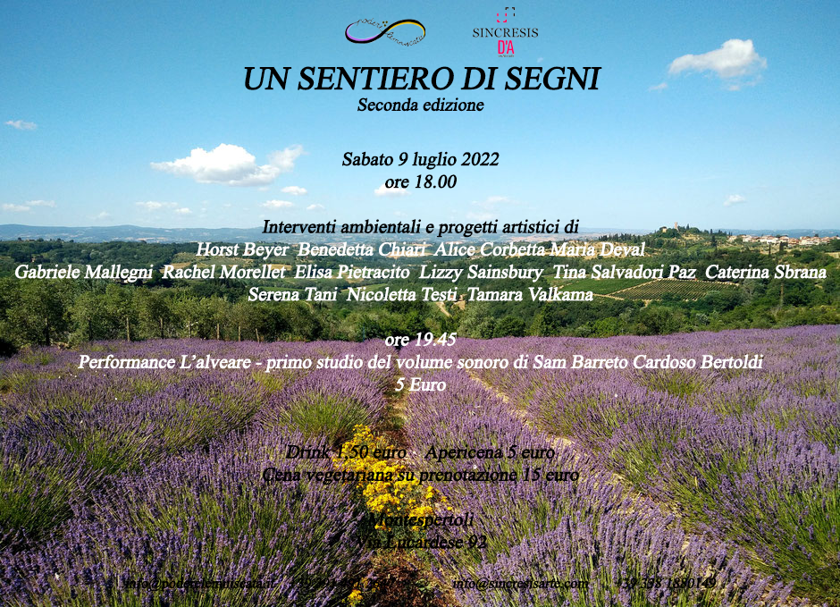 Sabato 9 luglio 2022 dalle ore 18.00 al Podere Lemniscatain Via Lucardese 92 Montespertoli si terrà 'Un sentiero di segni', a cura di Sincresis Associazione culturale per le arti contemporanee in collaborazione con Podere Lemniscata.