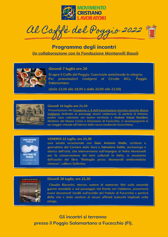 Appuntamento dunque al “Caffè del Poggio”, venerdì 22 luglio alle 21,30 con Gian Antonio Stella e Salvatore Settis nella suggestiva cornice del Poggio Salamartano (in caso di maltempo l’evento si svolgerà nell’adiacente “Sala del Poggio”). Per motivi organizzativi è gradita la prenotazione (info@fondazionemontanelli.it; oppure 057122627). L’iniziativa è della Fondazione Montanelli Bassi in collaborazione con il Circolo MCL e con il patrocinio del Comune di Fucecchio.
