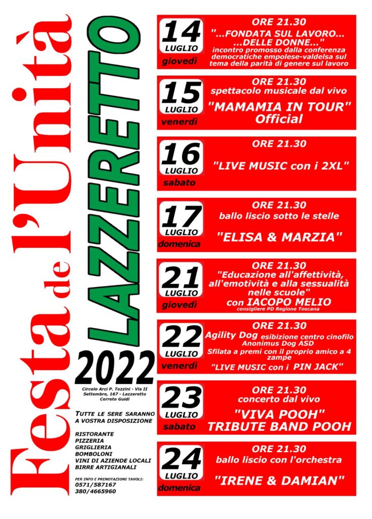 Ma ecco, nel dettaglio, il programma della Festa de L’Unità di Lazzeretto: