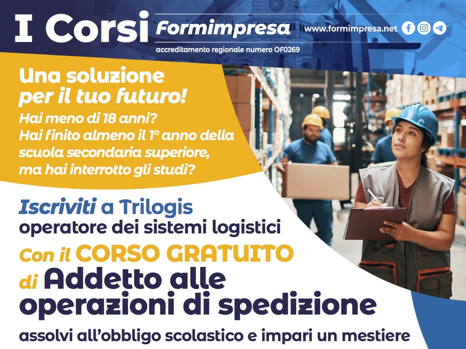 Sono aperte fino al 15 settembre le iscrizioni a Trilogis il corso di formazione, interamente gratuito, per diventare addetto alle operazioni di spedizione che si svolgerà a Siena, organizzato dall’agenzia formativa Formimpresa e rivolto a ragazzi e ragazze con meno di 18 anni che hanno concluso almeno il primo anno della scuola secondaria superiore ma hanno interrotto gli studi.