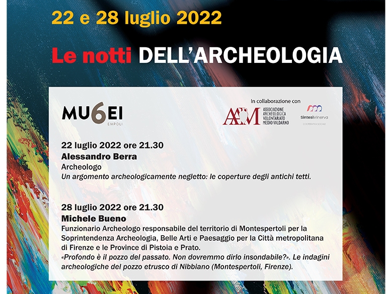 Due date, il 22 e il 28 luglio 2022, altrettanti appuntamenti dedicati alle Conversazioni di archeologia a Empoli. E' la proposta, promossa dal Comune di Empoli e da Empoli Musei con Associazione archeologica Medio Valdarno e cooperativa sociale SintesiMinerva onlus, in occasione de Le Notti dell'Archeologia 2022, a cura della Regione Toscana: il progetto, alla ventiduesima edizione, prevede aperture straordinarie serali ed eventi in musei, parchi e aree archeologiche della Toscana.