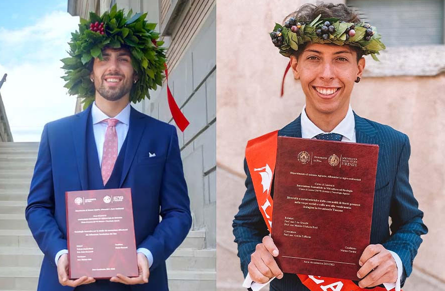 Sono Matteo Cantini e Nicola Mercanti i primi due laureati in "Innovazione Sostenibile in Viticoltura ed Enologia", il corso di laurea magistrale inter-ateneo tra l’Università di Pisa e l'Università degli Studi di Firenze attivato nell'anno accademico 2020/21. Il percorso di studi mira alla formazione di figure professionali capaci di svolgere attività complesse di pianificazione, gestione, controllo e coordinamento nell’ambito dell’intera filiera vitivinicola in un’ottica di sostenibilità e tutela dell’ambiente, impiegando consapevolmente rigorosi metodi scientifici e strumenti di lavoro innovativi. Claudio D’Onofrio (Università di Pisa) e Lisa Granchi (Università degli Studi di Firenze), rispettivamente presidente e vicepresidente del corso di laurea, esprimono grande soddisfazione per il conseguimento della laurea di Matteo Cantini e Nicola Mercanti entro i due anni previsti dal corso di studio, ed entrambi con la votazione di 110/110 e lode.