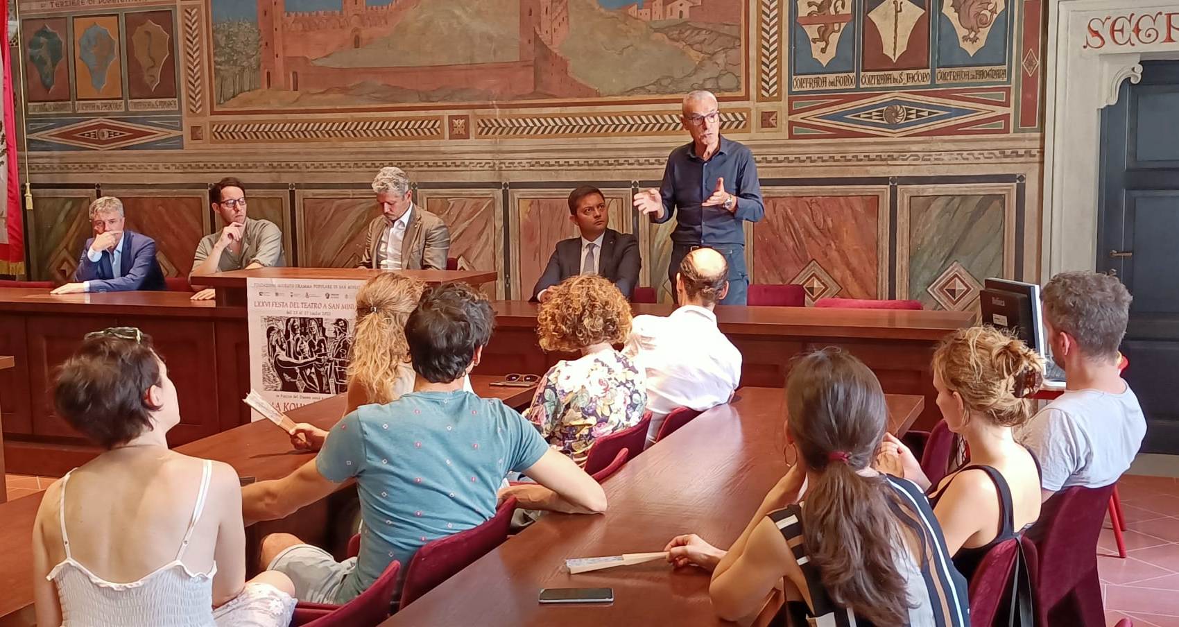 "Il Dramma è uno dei due appuntamenti principali di San Miniato - spiega il sindaco Simone Giglioli, che ha fatto gli onori di casa assieme all'assessore alla cultura Loredano Arzilli - assieme alla Mostra del Tartufo in autunno. Teniamo molto all'appuntamento di benvenuto in Palazzo Comunale, con il quale ogni anno vogliamo dare il benvenuto in Città alla compagnia dello spettacolo di punta della Festa del teatro. Siamo felici di averlo potuto ripetere senza restrizioni, per la prima volta dall'inizio della pandemia. Il Dramma è molto atteso dalla cittadinanza, e siamo sicuri che l'attualità del testo, unita alla grande forza espressiva di questo giovane regista, sapranno regalarci uno spettacolo davvero indimenticabile"