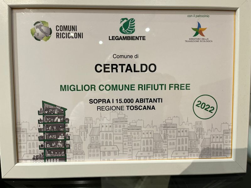Grazie al suo operato il Comune certaldese continua ad aggiudicarsi, per il terzo anno consecutivo, il primo posto in classifica dei Comuni Ricicloni, iniziativa di Legambiente che ogni anno premia le comunità locali, amministratori e cittadini, che hanno ottenuto i migliori risultati nella gestione dei rifiuti.