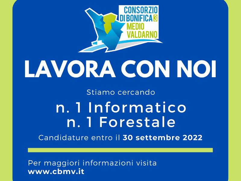 Maggiori informazioni, indicazioni e dettagli sono disponibili sul sito del Consorzio di Bonifica Medio Valdarno www.cbmv.it, nell’avviso di selezione e relativi allegati disponibili qui per la Selezione Settore Informatico e qui per la Selezione Settore Forestale o in Amministrazione Trasparente.