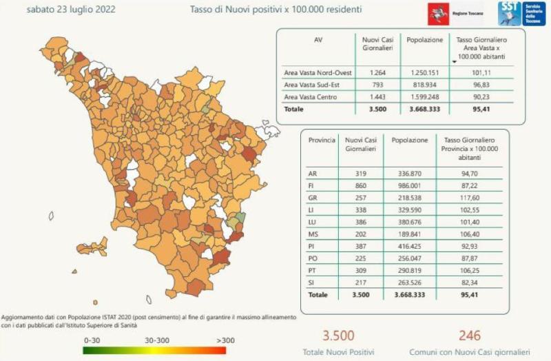 La Toscana si trova al 9° posto in Italia come numerosità di casi (comprensivi di residenti e non residenti), con circa 35.629 casi per 100.000 abitanti (media italiana circa 34.673 x100.000, dato di ieri). Le province di notifica con il tasso più alto sono Pisa con 36.483 casi x100.000 abitanti, Firenze con 36.467, Lucca con 36.237, la più bassa Grosseto con 32.579.