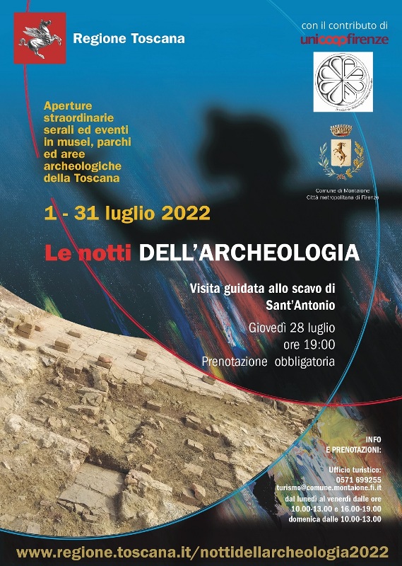 Il Comune di Montaione, che aderisce da molti anni all’iniziativa, quest’anno, in collaborazione con l’Associazione Archeologica della Valdelsa Fiorentina, giovedì 28 luglio propone la visita guidata al sito romano di Sant’Antonio, grazie alla quale sarà possibile conoscere la storia di tale insediamento e lo stato attuale della ricerca archeologica. La visita, prevista a partire dalle ore 19, sarà a cura degli archeologi che si occupano dello scavo.