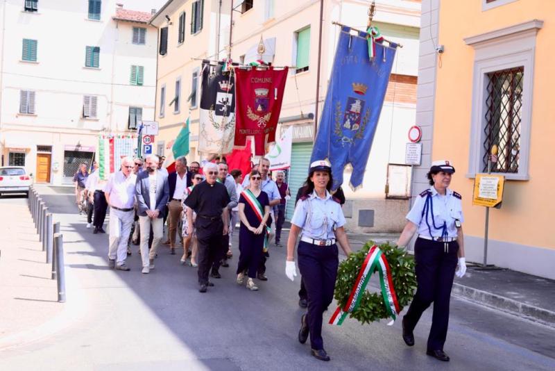 Dopo la messa, è partito il corteo con in testa il gonfalone comunale che ha raggiunto Piazza 24 luglio dove è intervenuta la sindaca Barnini, dopo aver deposto una corona d’alloro alla Lapide-Ricordo.
