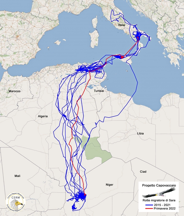 Le tappe salienti della sua vita avventurosa sono le seguenti: nel 2015, durante la sua prima migrazione autunnale, Sara attraversò il Mar Mediterraneo dalla Sicilia alla Libia (un volo di 550 km sul mare senza scalo) e raggiunse i luoghi di svernamento il 21 settembre, dopo aver percorso 3.980 km in 28 giorni; durante la migrazione autunnale del 2019 sorvolò l'Isola di Pantelleria assieme a Tobia, un altro capovaccaio allevato in cattività e rilasciato dall'Associazione CERM nel 2015, ma non nello stesso luogo di rilascio di Sara bensì in Calabria; durante la migrazione autunnale del 2020 Sara fu osservata di nuovo nell'Isola di Pantelleria, questa volta in compagnia di un capovaccaio nato in natura, al quale ha potuto fare da guida nel suo primo viaggio verso l’Africa.