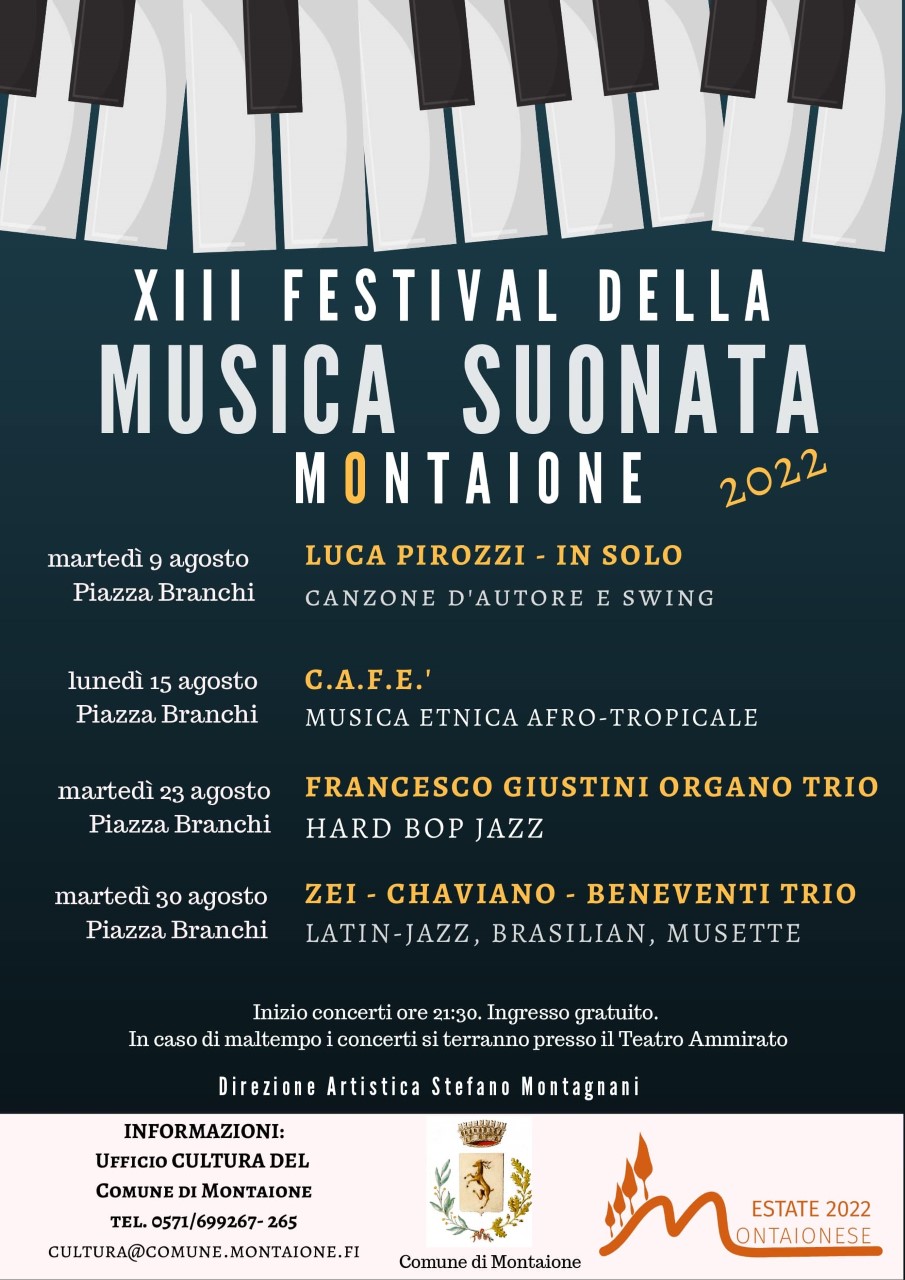 Giunge al tredicesimo anno il Festival della Musica Suonata di Montaione, la fortunata rassegna musicale ideata ed organizzata dal musicista montaionese Stefano Montagnani con l’Amministrazione Comunale. La manifestazione è divenuta ormai uno degli eventi di punta del fitto cartellone dell’Estate Montaionese. Anche per quest’anno quattro serate di spettacoli musicali di grande interesse culturale e di alto profilo qualitativo.