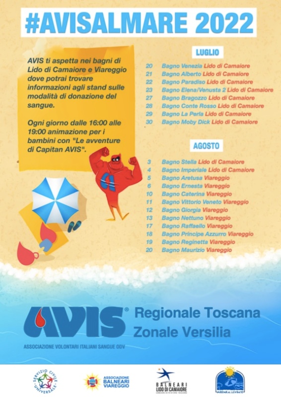 Nei bagni di Lido di Camaiore e Viareggio, Avis, attraverso uno stand, fornirà informazioni sulle modalità di donazione del sangue. Previsti anche momenti di animazione per i più piccoli dalle 16 alle 19 con “Le avventure di Capitan Avis”.