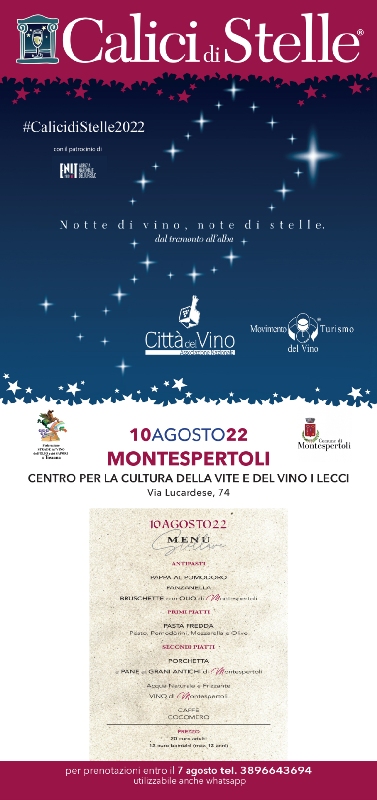 L'evento, organizzato dal Comune di Montespertoli in collaborazione con l'Associazione Nazionale Città del Vino e con la Federazione Strade del Vino, dell'olio e dei sapori presenta un ricco e gustoso menù accompagnato da prodotti di eccellenza e dai migliori vini di Montespertoli. Si consiglia la prenotazione della cena entro il 7 agosto, al numero: 3896643694 anche via WhatsApp.