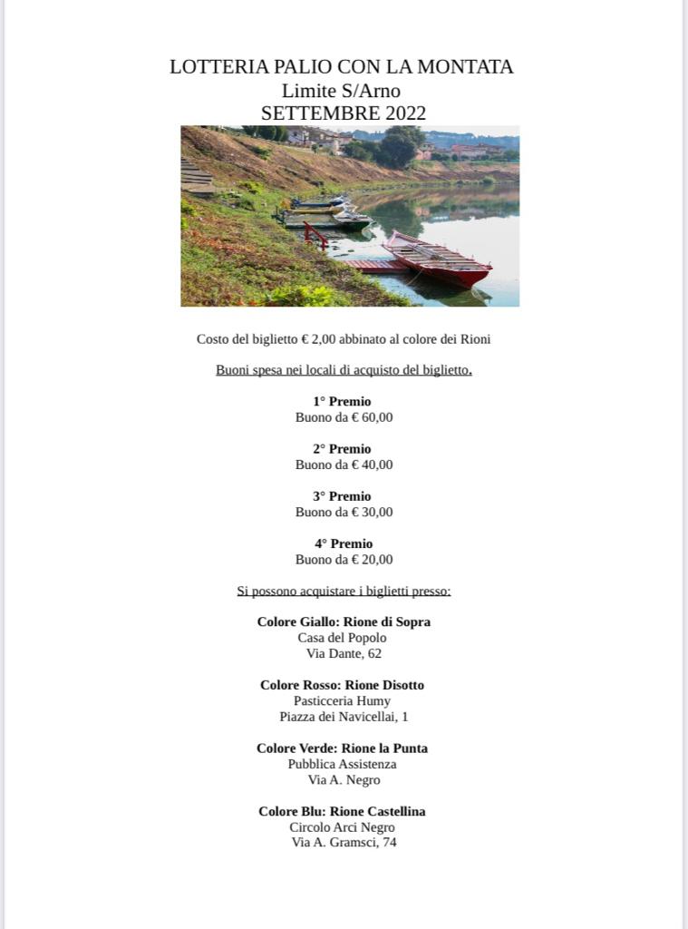 E' partita la vendita dei biglietti della seconda edizione della "LOTTERIA DEI RIONI", ideata ed organizzata dalla Pro Loco di Capraia e Limite ed abbinata al PALIO CON LA MONTATA, l'evento clou che ogni anno fa sfidare i quattro Rioni di Limite sull'Arno a bordo dei gozzi marinari ottocenteschi nelle acque del fiume Arno.