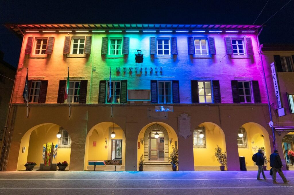 Non dimenticare le guerre in corso, anche nei giorni delle vacanze. La facciata del municipio del Comune di Cascina torna a illuminarsi con i colori della bandiera della pace per ricordare come i conflitti non si siano fermati.