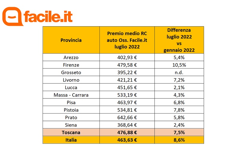 A seguire la tabella con il premio medio registrato in Toscana a luglio 2022 e la variazione percentuale rispetto a gennaio 2022