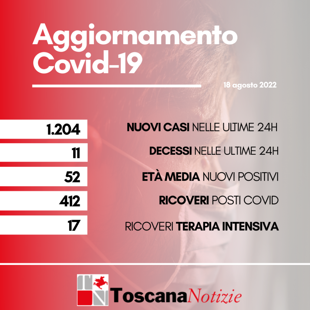 Contagi 18 agosto. In Toscana sono 1.364.093 i casi di positività al Coronavirus, 1.204 in più rispetto a ieri (214 confermati con tampone molecolare e 990 da test rapido antigenico). I nuovi casi sono lo 0,1% in più rispetto al totale del giorno precedente. I guariti crescono dello 0,1% e raggiungono quota 1.269.225 (93% dei casi totali). Oggi sono stati eseguiti 1.224 tamponi molecolari e 7.943 tamponi antigenici rapidi, di questi il 13,1% è risultato positivo. Sono invece 1.809 i soggetti testati oggi (con tampone antigenico e/o molecolare, escludendo i tamponi di controllo), di cui il 66,6% è risultato positivo. Gli attualmente positivi sono oggi 84.279, -0,6% rispetto a ieri. I ricoverati sono 412 (32 in meno rispetto a ieri), di cui 17 in terapia intensiva (2 in meno). Oggi si registrano 11 nuovi decessi: 5 uomini e 6 donne con un'età media di 85,1 anni.