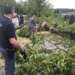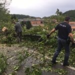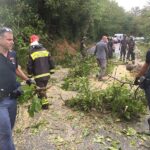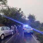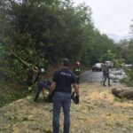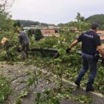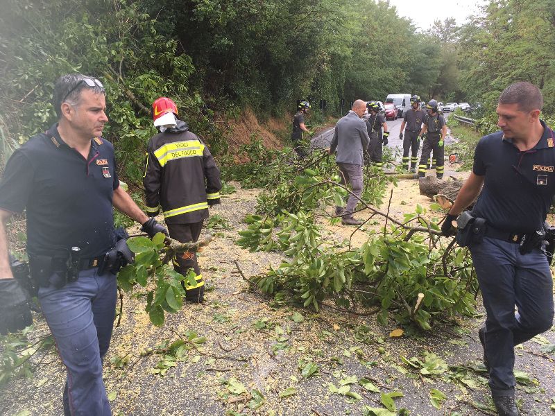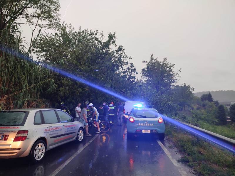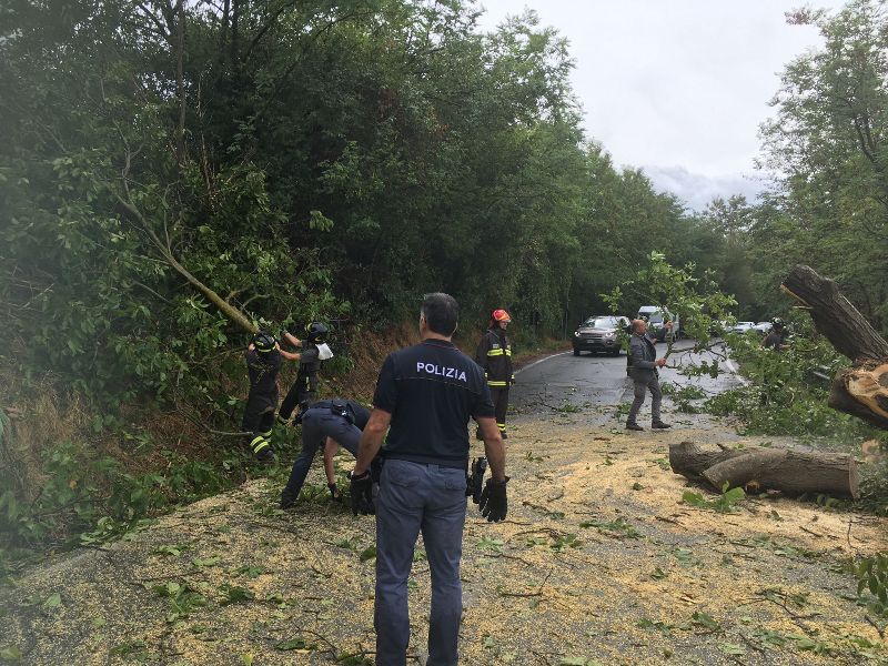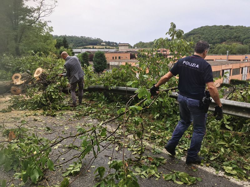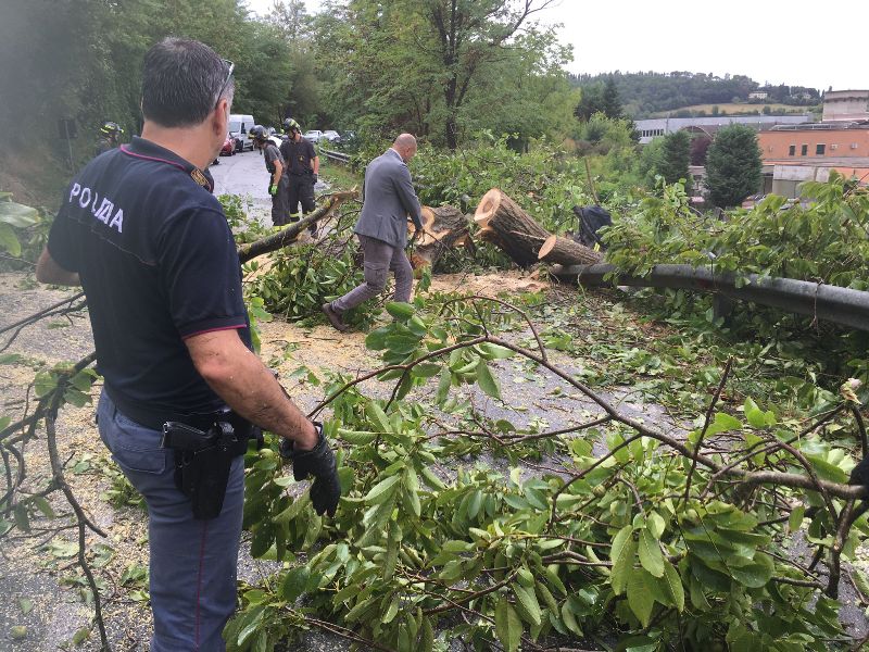 In foto la volante del commissariato di Poggibonsi impegnata in attività di soccorso ad un cittadino, in località Pian dei Peschi, a seguito della caduta di un albero che ha colpito il furgone sul quale viaggiava. L'uomo è rimasto ferito ma non in modo grave.