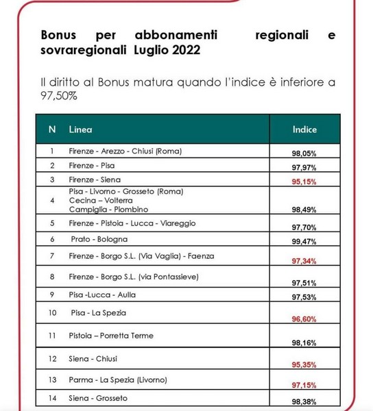 Nel mese di luglio l'indice di affidabilità di 5 linee regionali è sceso sotto la soglia prevista dal contratto di servizio tra Regione Toscana e Trenitalia che per il 2022 è fissata a 97,5%. Le linee in questione sono Firenze-Siena (95,15%), Firenze - Borgo S.L.(Via Vaglia)–Faenza (97,34%), Pisa-La Spezia (96,60%), Siena-Chiusi (95,35%) e