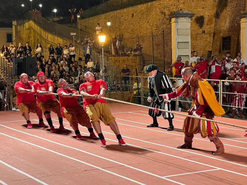 Nella prima sfida, tra Porta Fiorentina e Santa Maria al Pozzolo vincono i giallorossi. Finalissima tra Porta al Palagio e Porta Caracosta, entrambe vincitrici nel turno iniziale. Dopo una lotta di resistenza alla strattonata più forte, si aggiudica la seconda manche del tiro alla fune Porta al Palagio.