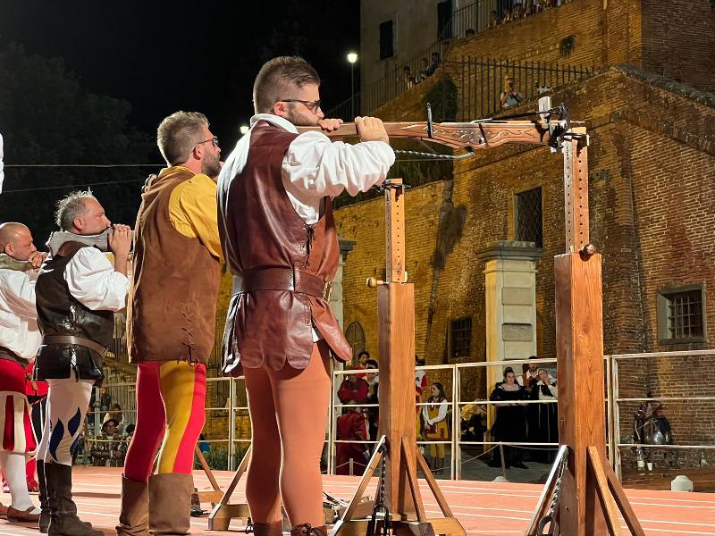 Primo gioco tiro con la balestra. I tiri impeccabili delle frecce mirano con precisione estrema i bersagli al di là della pedana, sotto la scalinata della Villa. Ma la mira più precisa è quella di Porta Caracosta, che si aggiudica con 140 punti (4 in gara) la prima sfida infuocando i cori dei contradaioli in tribuna. Seconda Porta Fiorentina ad un solo punto di distanza (3 punti gara), 139. Seguono Palagio con 138 (2 punti gara) e Santa Maria al Pozzolo che chiude la classifica, a quota 135 (1 punto gara).