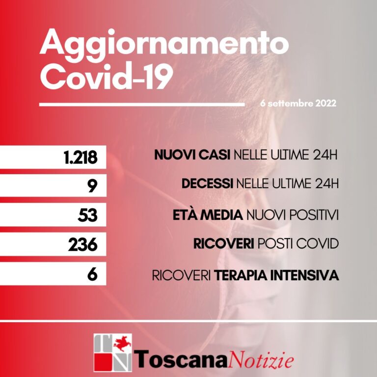 Contagi 6 settembre. In Toscana sono 1.381.088 i casi di positività al Coronavirus, 1.218 in più rispetto a ieri (158 confermati con tampone molecolare e 1.060 da test rapido antigenico). I nuovi casi sono lo 0,1% in più rispetto al totale del giorno precedente. I guariti crescono dello 0,1% e raggiungono quota 1.290.367 (93,4% dei casi totali). Oggi sono stati eseguiti 1.163 tamponi molecolari e 9.477 tamponi antigenici rapidi, di questi l'11,4% è risultato positivo. Sono invece 2.022 i soggetti testati oggi (con tampone antigenico e/o molecolare, escludendo i tamponi di controllo), di cui il 60,2% è risultato positivo. Gli attualmente positivi sono oggi 80.046, -0,2% rispetto a ieri. I ricoverati sono 236 (10 in più rispetto a ieri), di cui 6 in terapia intensiva (1 in meno). Oggi si registrano 9 nuovi decessi: 6 uomini e 3 donne con un'età media di 90,1 anni.