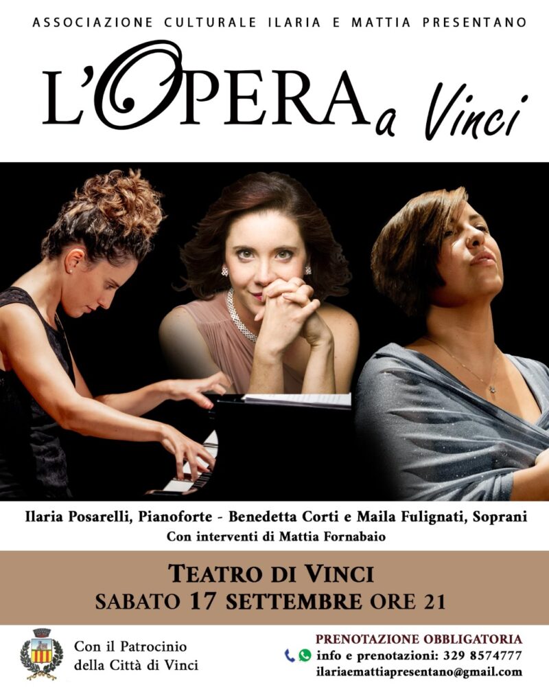 Torna anche quest'anno al Teatro di Vinci, dopo il successo di pubblico della scorsa stagione, l'Associazione Culturale "Ilaria e Mattia Presentano". Primo appuntamento: "L'Opera a Vinci - Le più belle arie d'opera di sempre". Una selezione delle più celebri arie d'opera e dei duetti scelti tra i più grandi capolavori di tutti i tempi, interpretate dai Soprani Maila Fulignati e Benedetta Corti e dalla pianista Ilaria Posarelli.Nella serata di sabato 17 settembre saranno eseguiti brani tratti da opere come "Le nozze di Figaro" di W. A. Mozart, "La Traviata" di Giuseppe Verdi, "Il barbiere di Siviglia" di Rossini, "La Bohème", "Gianni Schicchi" e "Madama Butterfly" di Giacomo Puccini e altre ancora, impreziosite da brani solistici al pianoforte. Ad arricchire la serata interventi a cura dell'attore Mattia Fornabaio. Con il Patrocinio della Città di Vinci.