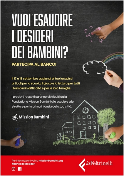 A loro, per l’intero fine settimana 17-18 settembre, è dedicata la quarta edizione del “Banco dei Desideri”, evento annuale promosso dalla Fondazione Mission Bambini in collaborazione con Librerie Feltrinelli: due giornate in cui in 111 librerie laFeltrinelli di oltre 70 città italiane, tra cui Firenze, sarà possibile acquistare libri, giochi e prodotti di cartoleria da donare a questi piccoli studenti in difficoltà.