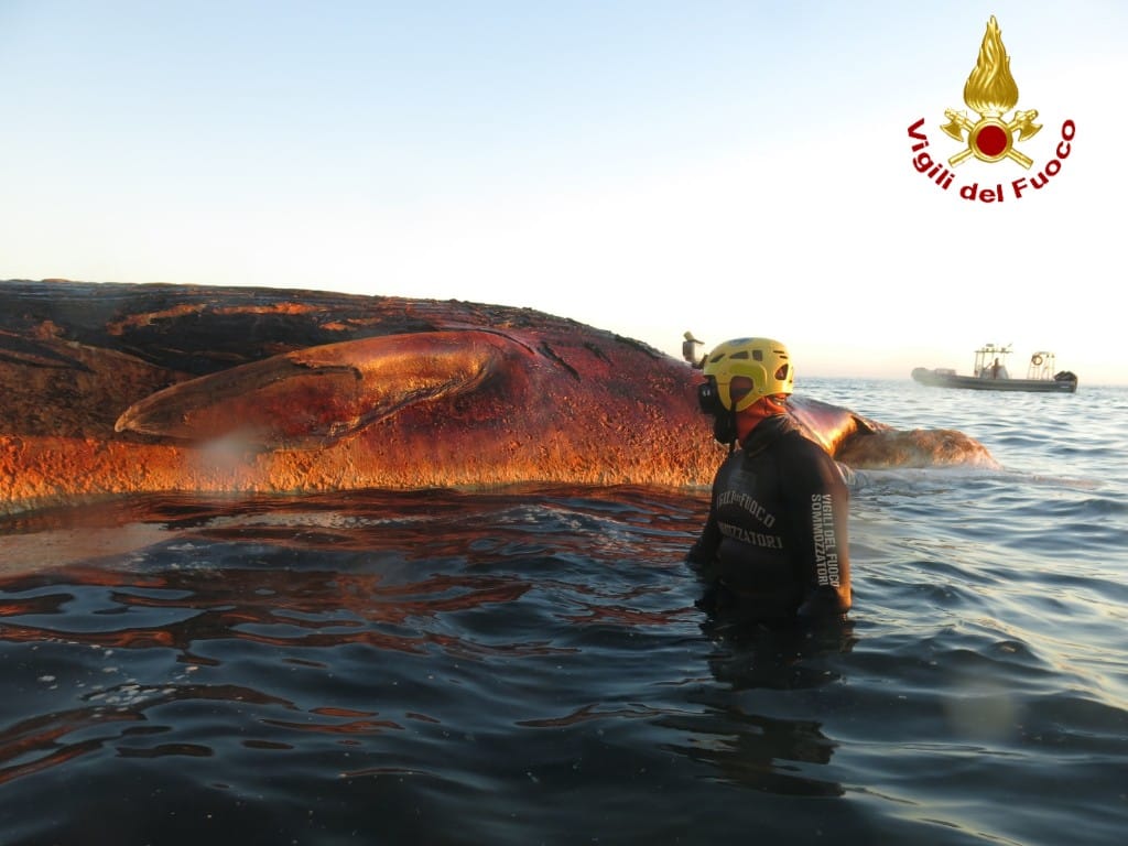 Il personale della Guardia Costiera, presente anche da terra, unitamente ai subacquei dei Vigili del Fuoco hanno effettuato una prima ispezione dell’animale ma, visto il cattivo stato della carcassa, constatavano l’impossibilità di eseguire operazioni di traino via mare, anche a causa del buio ormai incombente.