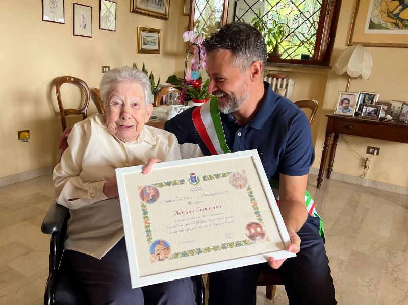 Bagno a Ripoli festeggia i cento anni di Adriana Ciampolini. Domenica 11 settembre la donna, originaria di Firenze ma residente a Bagno a Ripoli, ha tagliato il secolo di età. Francesco Casini, sindaco ripolese, le ha portato una targa e gli auguri del comune.