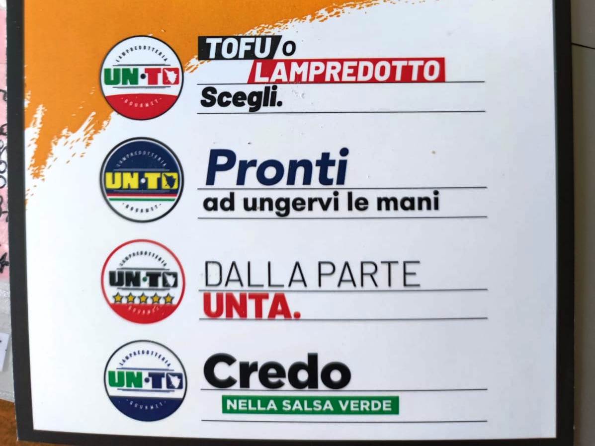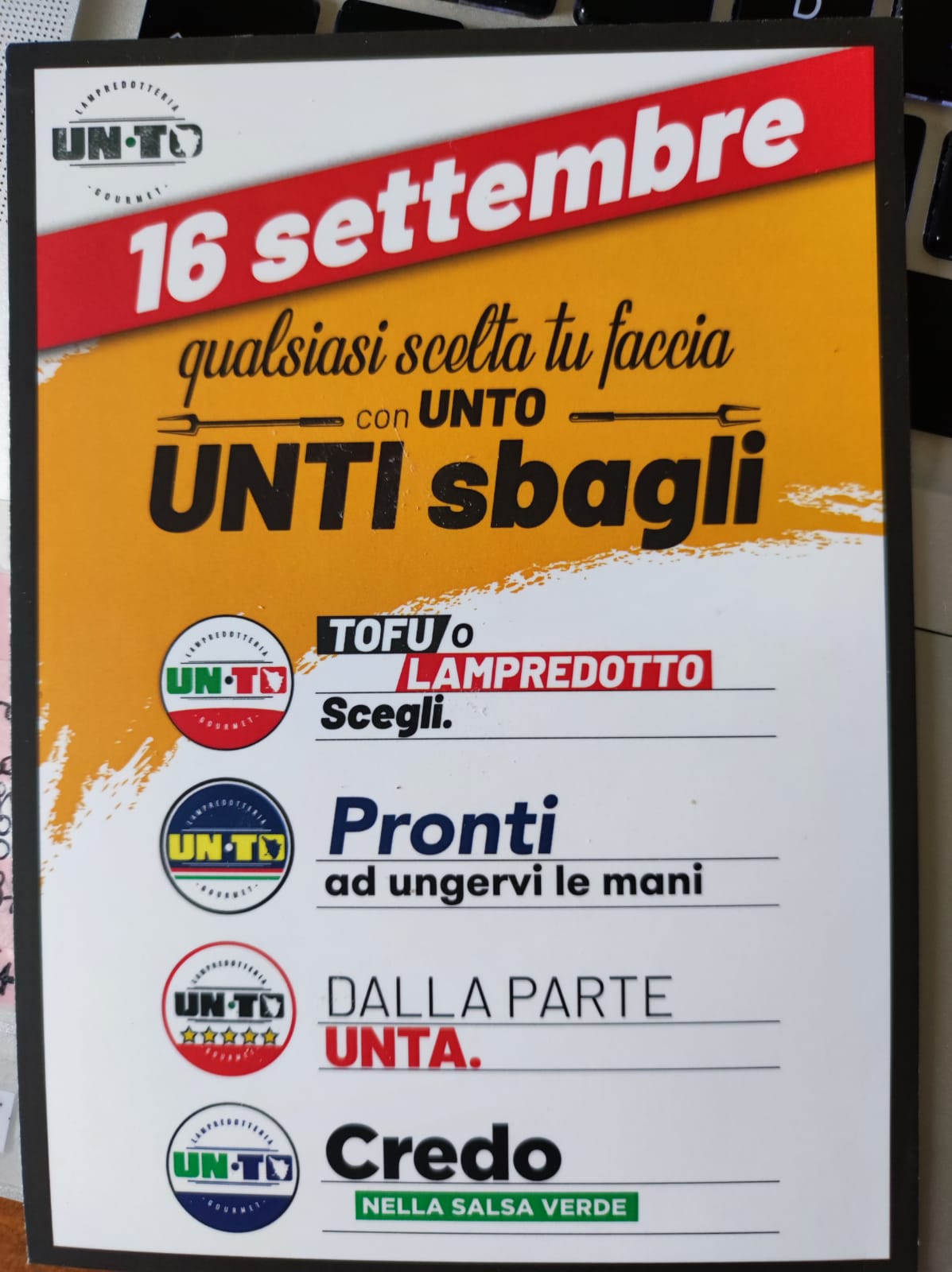 In questi volantini vengono riconvertiti i messaggi elettorali dei principali partiti che correranno alle elezioni... in salsa gourmet. E' così che UN-TO cambia il claim elettorale del Pd in 'Tofu o lampredotto. Scegli', aggiorna il messaggio dei manifesti di Fratelli d'Italia in 'Pronti, ad ungervi le mani'. Non manca anche il messaggio del Movimento 5 Stelle, che passando dalle cucine di via Roma diventa 'Dalla parte unta'. Infine il motto della Lega, un 'Credo nella salsa verde' che rende inconfondibile di cosa stiamo parlando: del toscanissimo lampredotto.