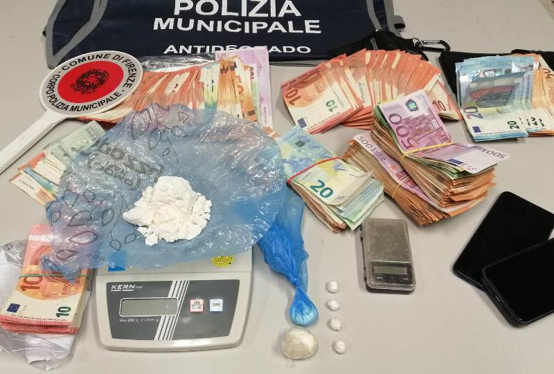 70 grammi di cocaina, l’attrezzatura per confezionare le dosi, 32mila euro e abbigliamento, profumi e orologi di marca probabile provento dell’attività di spaccio. Ecco cosa hanno trovato gli agenti della Polizia Municipale durante la perquisizione dell’alloggio di un pusher. L’uomo, un cittadino nordafricano di 32 anni già noto alla Squadra Antidroga della Municipale per precedenti specifici, era stato individuato mentre circolava in scooter in zona Porta Romana e pedinato fino a quella che gli agenti hanno presunto essere la sua abitazione (fino a quel momento era conosciuto come senza fissa dimora).