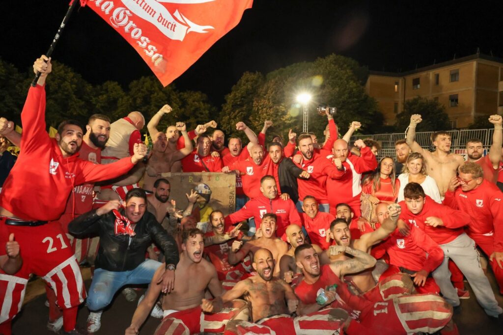 Sono i Rossi di Santa Trinita a confermarsi campioni della Palla Grossa per la terza edizione consecutiva. Il successo arriva davanti a un pubblico da tutto esaurito, al termine di una finale combattuta ma con le Aquile sempre in controllo del punteggio. Finisce 13-6 per i Rossi, ma l’onore delle armi va anche ai Gialli che non si sono mai arresi durante l’ora di gioco, dando l’impressione a tratti di potere riaprire la contesa.