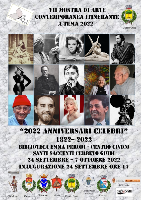 Sarà inaugurata sabato 24 settembre 2022 alle ore 17 nei locali del Centro Culturale "Santi Saccenti" di Cerreto Guidi, alla presenza del Sindaco Simona Rossetti, la mostra itinerante d’arte contemporanea "2022 Anniversari Celebri".