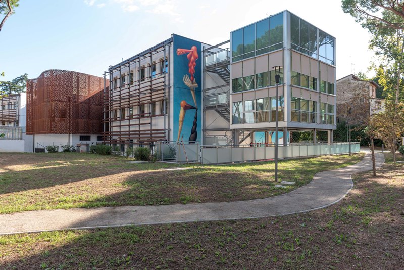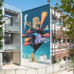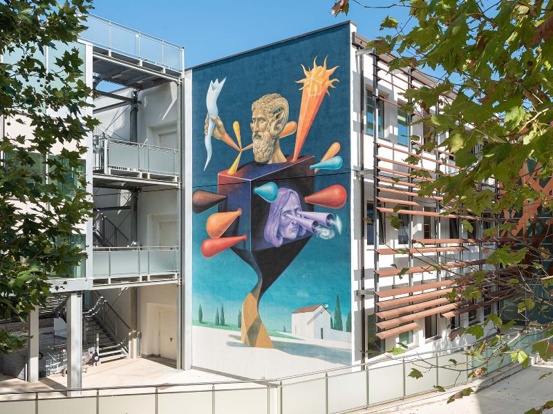 Il work in progress, iniziato venerdì 2 settembre, si è concluso a domenica 18 e ha visto l’artista cimentarsi con il tema della cosmologia e del progresso scientifico all’interno del contesto urbano fiorentino. Le pareti oggetto di destinazione dell’intervento sono parte dell’edificio che ospita la Scuola Secondaria di primo grado Dino Compagni in via Giuseppe Sirtori 58 (Campo di Marte), Quartiere 2 e si estendono su una superficie di oltre 160mq.
