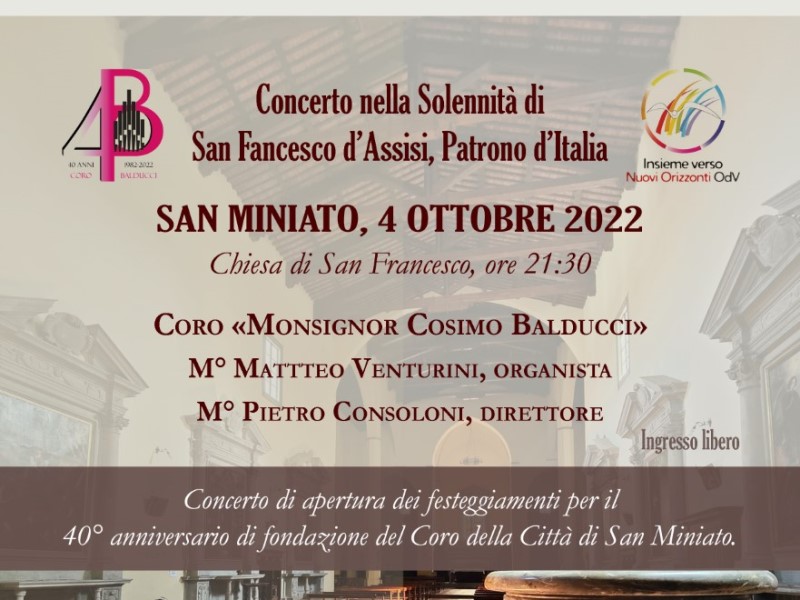 Martedì 4 ottobre 2022, nella Solennità di San Francesco d’Assisi, patrono d’Italia dal 1939, il Coro «Monsignor Cosimo Balducci» della Città di San Miniato presenta il primo di una serie di concerti organizzati per festeggiare i suoi 40 anni di attività. L’appuntamento è fissato per le ore 21:30 nella monumentale e suggestiva Chiesa di San Francesco in San Miniato, situata nell’omonima piazza.