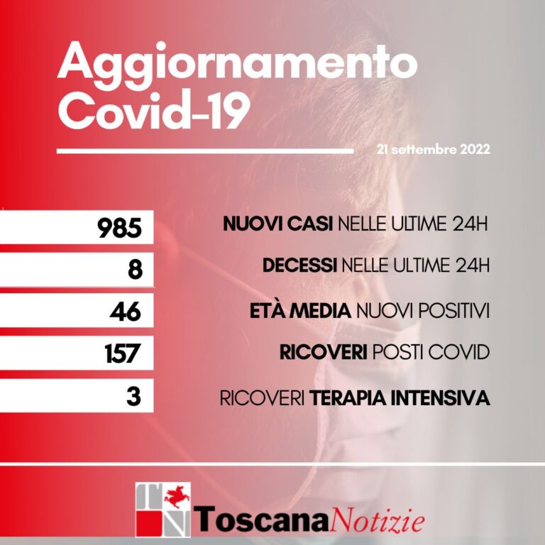 Contagi 22 settembre. Sono 1.045 i nuovi casi di Covid-19 registrati nelle ultime ventiquattro ore in Toscana: 176 sono stati confermati con tampone molecolare e gli altri 869 con test rapido.