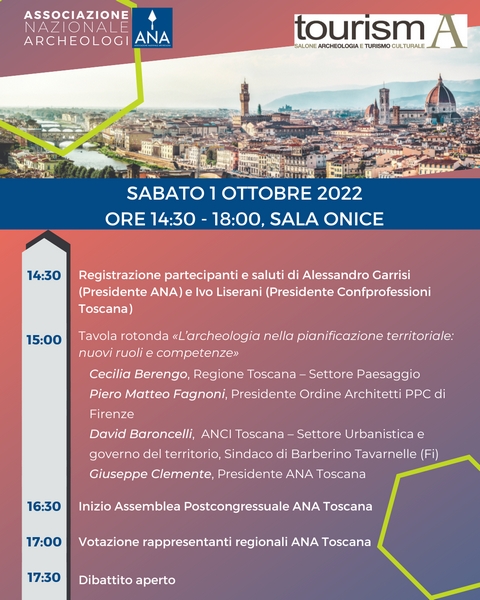 Anche quest’anno l’Associazione Nazionale Archeologi sarà presente a tourismA 2022, il Salone dell’Archeologia e del Turismo Culturale, che si terrà a Firenze dal 30 settembre al 2 ottobre, con un calendario ricco di eventi, workshop e presentazioni. L'ANA sarà presente al Salone con la consueta e ampia partecipazione, sia attraverso uno stand espositivo, con incontri e presentazioni dedicate a soci e non soci, sia tramite un momento di approfondimento scientifico su un tema sempre più centrale nell'archeologia contemporanea, sul quale proprio il momento di ripresa post pandemico ha imposto un’accurata ed approfondita disamina in merito ai nuovi ruoli e competenze dell’archeologo nella pianificazione territoriale, tematica estremamente attuale in questa nuova stagione di cambiamenti e sviluppo, determinata anche dal PNRR per il rilancio dell’economia del Paese.