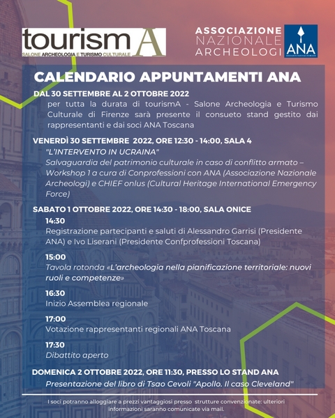 Anche quest’anno l’Associazione Nazionale Archeologi sarà presente a tourismA 2022, il Salone dell’Archeologia e del Turismo Culturale, che si terrà a Firenze dal 30 settembre al 2 ottobre, con un calendario ricco di eventi, workshop e presentazioni. L'ANA sarà presente al Salone con la consueta e ampia partecipazione, sia attraverso uno stand espositivo, con incontri e presentazioni dedicate a soci e non soci, sia tramite un momento di approfondimento scientifico su un tema sempre più centrale nell'archeologia contemporanea, sul quale proprio il momento di ripresa post pandemico ha imposto un’accurata ed approfondita disamina in merito ai nuovi ruoli e competenze dell’archeologo nella pianificazione territoriale, tematica estremamente attuale in questa nuova stagione di cambiamenti e sviluppo, determinata anche dal PNRR per il rilancio dell’economia del Paese.