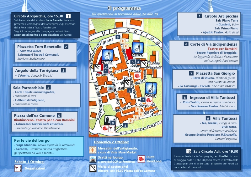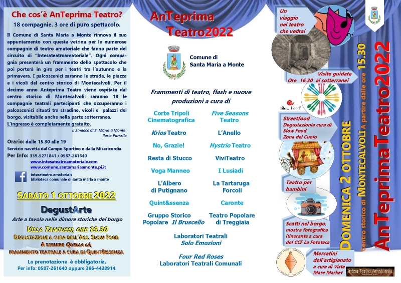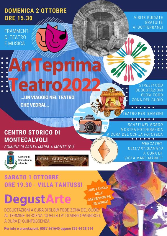 Domenica 2 ottobre 2022 si svolgerà nel centro storico di Montecalvoli Alto, nel comune di Santa Maria a Monte, la rassegna "Anteprima Teatro", che vedrà impegnate le compagnie di teatro amatoriale che partecipano al progetto "Intesateatro".