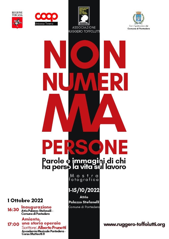 L'atrio di Palazzo Stefanelli ospiterà da sabato 1 Ottobre (inaugurazione ore 16,30) e fino al 15 Ottobre la mostra fotografica "Non numeri ma persone". 42 pannelli che mirano a sensibilizzare sul tema delle vittime nei luoghi di lavoro. L'iniziativa è della associazione nazionale per la sicurezza sul lavoro Ruggero Toffolutti, col sostegno e il patrocinio del Comune di Pontedera.