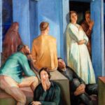 personalissimo dove i personaggi – tra i quali la madre, la sorella e la moglie dell’artista – si muovono entro spazi geometrici assoluti e astratti, di ascendenza neo-primitiva, capaci di trasmettere, secondo le parole dell’artista: “la realtà riflessa nella mia memoria lirica”.