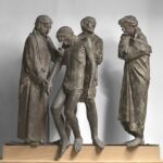 Il gruppo della Pietà, realizzato a cera persa presso la Fonderia Maf di Milano, è una variante di uno dei bronzi che costituiscono le quattro stazioni della Via Crucis eseguite per la basilica di Sant’Eugenio in via delle Belle Arti a Roma. Nel solco di un rinnovamento della cultura cattolica in senso umanista, promosso dall’amico don Giuseppe De Luca, Manzù si discosta dalla tradizione liturgica e freddamente dottrinale per attingere alla grande scultura donatelliana, approdando ad un brano di intensa e grave espressività. Quest’opera coincide con la definitiva consacrazione di Manzù, in un momento iniziato con il premio per la scultura alla Biennale di Venezia del 1948 e
