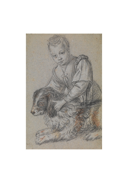 Si tratta di un foglio legato all’attività della bottega di Paolo Veronese, del quale Carletto Caliari è il figlio minore. È databile a dopo il 1588 quando, alla morte del padre, Carletto assunse un ruolo di maggior importanza nella gestione dell’impresa familiare, dopo aver lavorato per alcuni anni nella bottega dei Bassano. Il disegno raffigura una scena di genere, studiando un particolare di una composizione di maggiori dimensioni: probabilmente quello delle bambine che giocano con il cane alla base della Cena in Emmaus della scuola di Paolo Veronese, al Louvre.