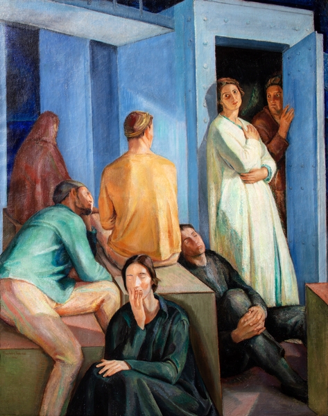 Realizzato nel 1925, questo capolavoro della prima maturità di Ferrazzi declina con una sensibilità moderna la grande tradizione dei maestri del Quattrocento e del Cinquecento italiano. Fu esposto l’anno successivo a New York, alla prestigiosa Exhibition of Modern Italian Art dove fu acquistato da Carl W. Hamilton, noto collezionista d’arte del Rinascimento italiano, che evidentemente apprezzò la solenne sintesi neo-quattrocentesca della composizione e forse certi richiami ai colori cangianti della pittura di Pontormo e Rosso Fiorentino. Come suggerisce il titolo, Ferrazzi rievoca qui il ricordo di un’esperienza personale, il viaggio in nave compiuto nel novembre 1917 verso la Sardegna, chiamato a prestarvi il servizio militare. L’episodio autobiografico risulta così trasfigurato, in virtù di uno stile