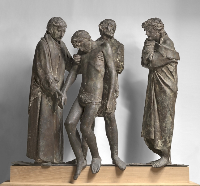 Il gruppo della Pietà, realizzato a cera persa presso la Fonderia Maf di Milano, è una variante di uno dei bronzi che costituiscono le quattro stazioni della Via Crucis eseguite per la basilica di Sant’Eugenio in via delle Belle Arti a Roma. Nel solco di un rinnovamento della cultura cattolica in senso umanista, promosso dall’amico don Giuseppe De Luca, Manzù si discosta dalla tradizione liturgica e freddamente dottrinale per attingere alla grande scultura donatelliana, approdando ad un brano di intensa e grave espressività. Quest’opera coincide con la definitiva consacrazione di Manzù, in un momento iniziato con il premio per la scultura alla Biennale di Venezia del 1948 e