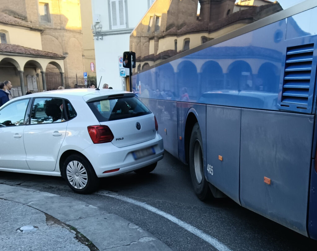 Auto parcheggiata in curva in piazza della Vittoria, bus non passa: traffico in tilt a Empoli