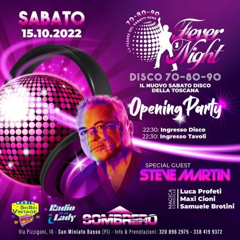 Tornano le serate in discoteca a San Miniato Basso, tornano gli eventi a firma Sombrero e partner Radio Lady 97.7 e Radio SeiSei Vintage. Sabato 15 ottobre debutta Fever Night, il nuovo sabato disco della Toscana dedicato alla musica ballabile degli anni '70, '80 e '90. L'opening party avrà come special guest Steve Martin, storico dj toscano. Alla consolle si alterneranno Luca Profeti, Maxi Cioni e Samuele Brotini. C'è ancora spazio per le prenotazioni al 320/8962975 e al 338/4199372.