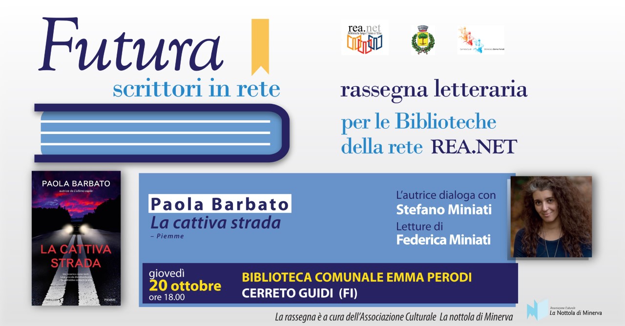 L’appuntamento presso la Biblioteca comunale “Emma Perodi” di Cerreto Guidi è fissato per Giovedì 20 ottobre alle ore 18,00 con la presentazione de “La cattiva strada” (Piemme)di Paola Barbato che sarà presente all’iniziativa dialogando con Stefano Miniati, mentre le letture saranno affidate a Federica Miniati.